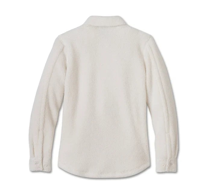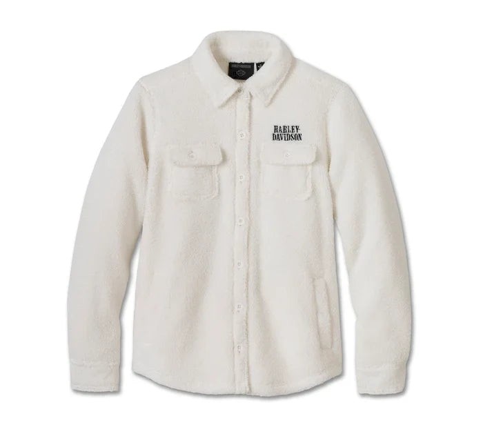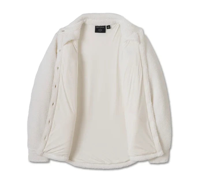 La giacca camicia Sherpa Harley-Davidson® in edizione limitata è perfetta per affrontare i rigori dell'inverno come dei veri appassionati di Harley-Davidson. Realizzata in sherpa di poliestere pesante e imbottito per offrire il massimo comfort. Questo capospalla femminile è dotato di tasche sul petto e di tasche scaldamani, oltre a un colletto con automatici che rimane in posizione sotto l'abbigliamento tecnico. Il branding è ridotto all'osso, con un ricamo sul davanti. Ordina ora fino ad esaurimento scorte.
